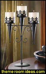 Lighting: Rustic looking electric fixtures in wood and metal - Iron - Pewter - free standing or ceiling hung iron or wooden Candelabras - Chandeliers - romantic candlesticks. Ornaments: Knights - medieval armor - Knights on horses - swords - Shields - Crests - Flags - Ornamental crosses - Dragons - Lions - medieval style goblets - Bowls - Fleur de Lis - The fleur-de-lis has appeared on countless European coats of arms and flags over the centuries. It is a symbol of royalty, purity and chastity. |